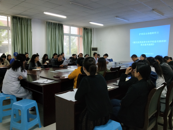 首先,钟正伟副主任组织大家认真学习了遵医专党政办发〔2018〕16 号文件《遵义医药高等专科学校监考教师职责及监考流程》,并要求教务科和学生科要求各班辅导员组织学生学习了《遵义医药高等专科学校考场规则及考生守则》。最后,护理系党总支书记张绍军强调:通过学习后,要求全系教职工要认真履行工作职责,严格管理,努力工作,遵循考试工作流程,确保考试各环节不出差错事故,创造良好的考试环境。